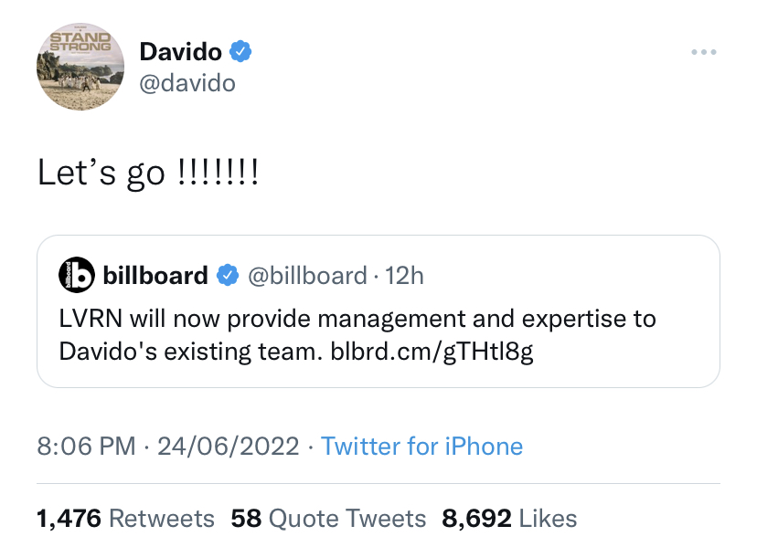 Davido made the announcement via Twitter by replying a tweet by Billboard confirming the news. He simply tweeted, “Let’s go”.