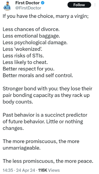 Regarding marriage, the doctor on X discussed why men should choose virgins.