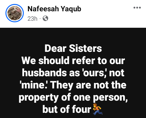Nafeesah Yaqub, a Muslim lady from Nigeria, has advised “sisters” to address their husbands as “ours” rather than “mine” because males are not a woman’s property.