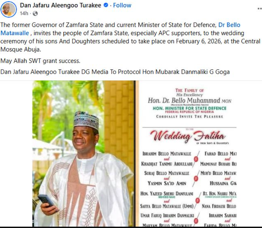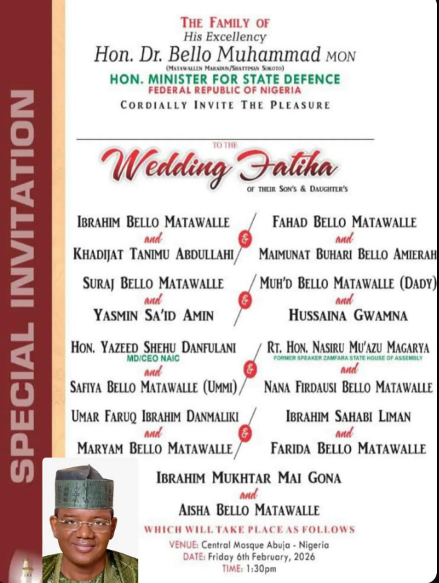 - Minister of State for Defence, Bello Matawalle, is reportedly planning a mass wedding for nine of his children on February 6, 2026, at the Central Mosque in Abuja, according to invitations circulating online.