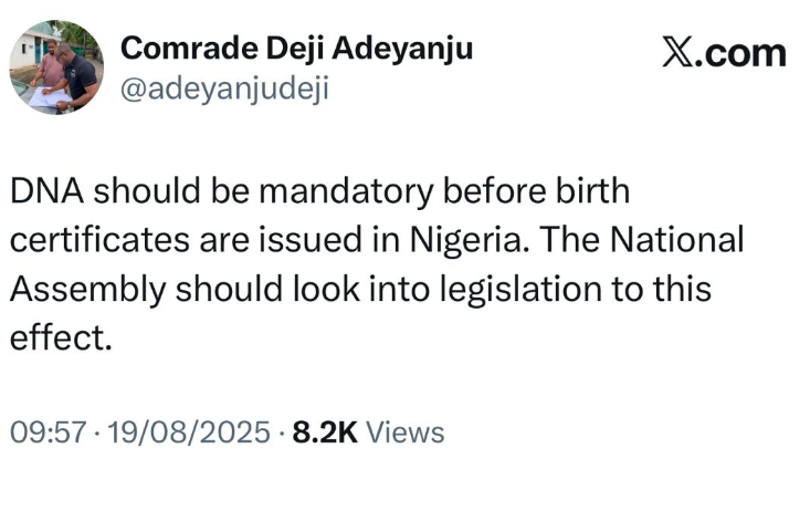 - Activist Deji Adeyanju urged the National Assembly to make DNA tests mandatory before issuing birth certificates, arguing it would help curb rising paternity fraud in Nigeria.