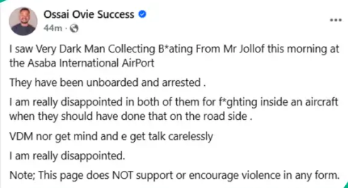 “I saw VeryDarkMan collecting b*ating from Mr Jollof this morning at the Asaba International Airport. They have been unboarded and arrested. I am really disappointed in both of them for fighting inside an aircraft when they should have done that on the roadside. VDM nor get mind and e get talk carelessly. I am really disappointed. Note: This page does NOT support or encourage violence in any form.”