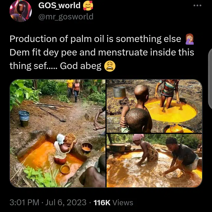 Gos: “Production of palm oil is something else. Dem fit dey pee and menstruate inside this thing sef. God abeg.”