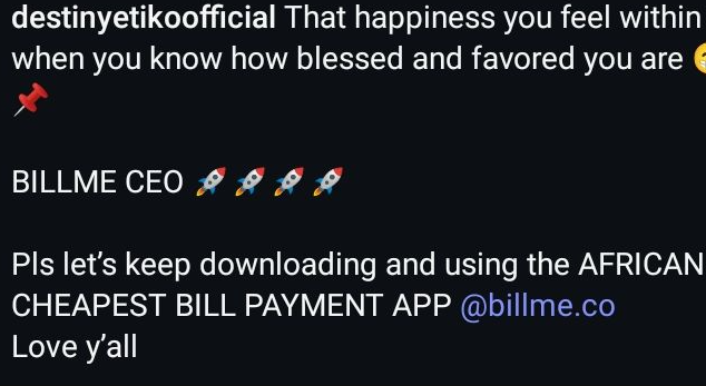 She shared her joy about feeling blessed and favored, and also promoted her new mobile payment platform, ‘Bill Me’.