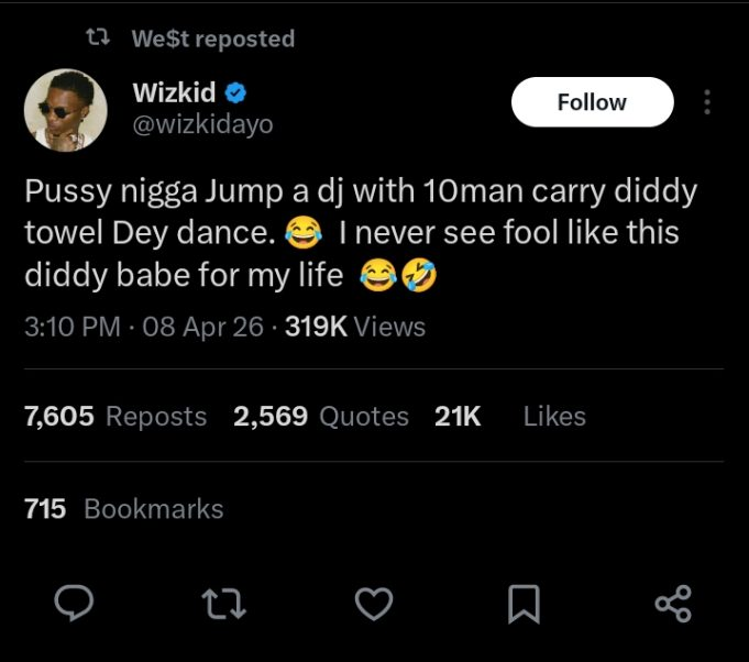 The controversy stems from claims that Burna and his crew confronted Tunez at Obi’s House in Lagos. Responding on X, Wizkid criticized Burna, calling him a “babe” and poking fun at a towel Burna wore in a recent video mocking Tunez, dubbing it the “DIDDY TOWEL.”