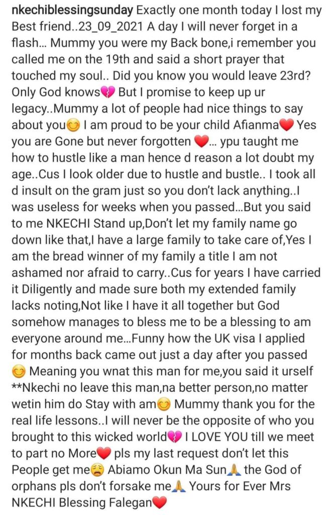 In October 2021, while remembering her mother just one month after her death, Nkechi revealed that her mother told her to never leave ODF no matter what he does to her because he is a good man.