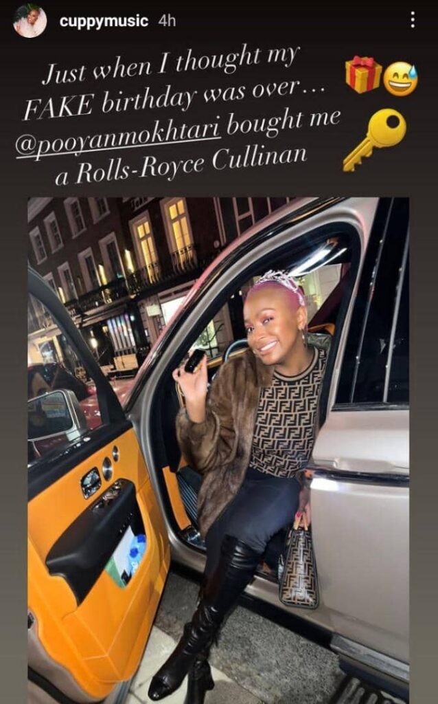 Popular Disc Jockey, Florence Otedola, better known as DJ Cuppy has received a Rolls Royce Cullman as a fake birthday gift from a friend after she was celebrated at a spot they went to have fun.