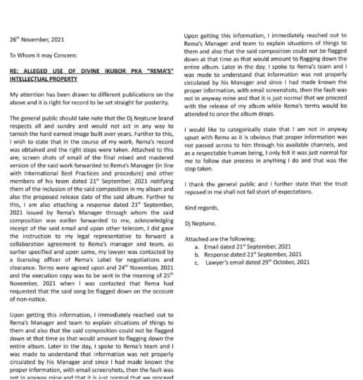 Singer Rema, in a series of posts on Twitter, had noted that he begged his manager to stall the release of his song but that Neptune and his team still went ahead with their plan.
