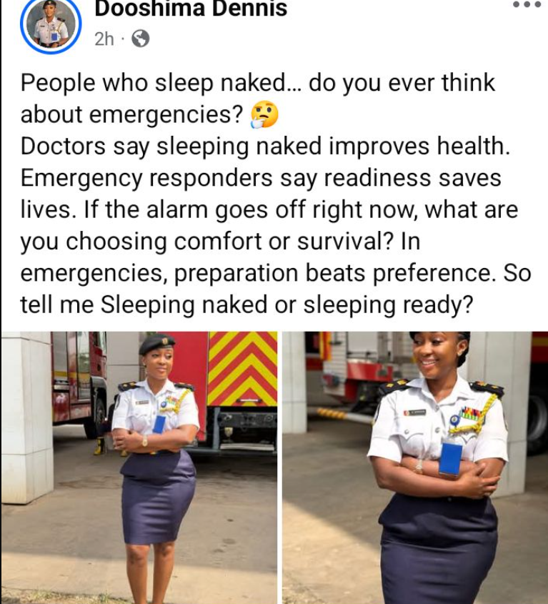 Dooshima Dennis, a Nigerian firefighter, has sparked online conversations after questioning people who prefer to sleep naked, raising concerns about emergency preparedness.