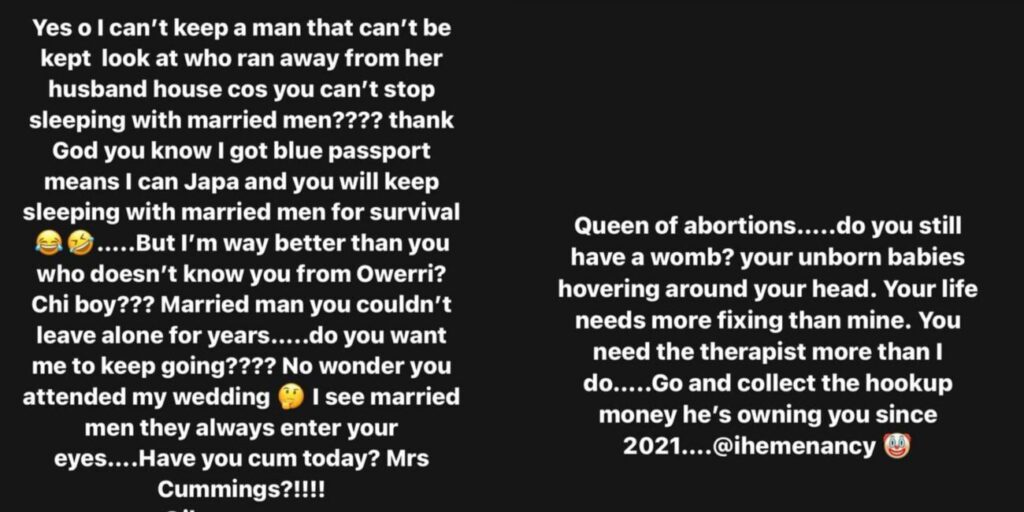 “Yes o I can’t keep a man that can’t be kept. Look at who ran away from her husband house cos you can’t stop sleeping with married men??? Thank God you know I got blue passport means I can Japa and you will keep sleeping with married men for survival….. But I’m way better than you who doesn’t know you from Owerri? Chi boy??? Married man you couldn’t leave alone for years….do you want to keep going??? No wonder you attended my wedding. I see married men they always enter your eyes…. Have you cum today? Mrs Cummings!!!