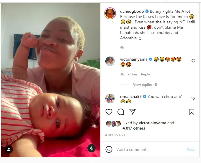 Uche Ogbodo shared a video showing moments her baby fought back as she planted kisses on her face and body.