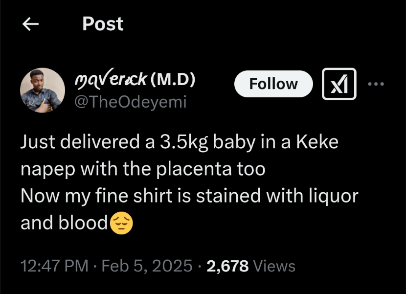 “Just delivered a 3.5kg baby in a Keke Napep, along with the placenta. Now my fine shirt is stained with liquor and blood😔,” he wrote.