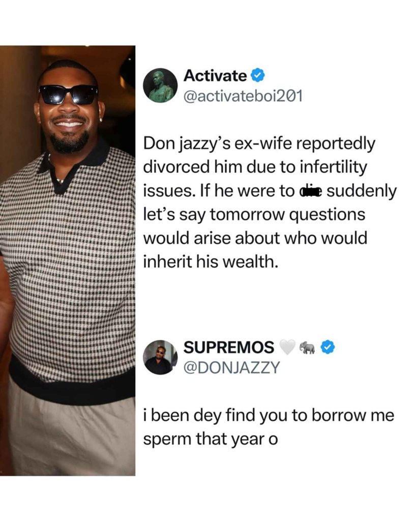 The user suggested that Don Jazzy’s divorce was due to infertility and went on to speculate that if the music executive were to pass away unexpectedly, questions would arise over who would inherit his assets.