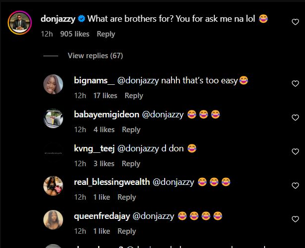 Don Jazzy wrote; “What are brothers for? You for ask me na lol 😂.”