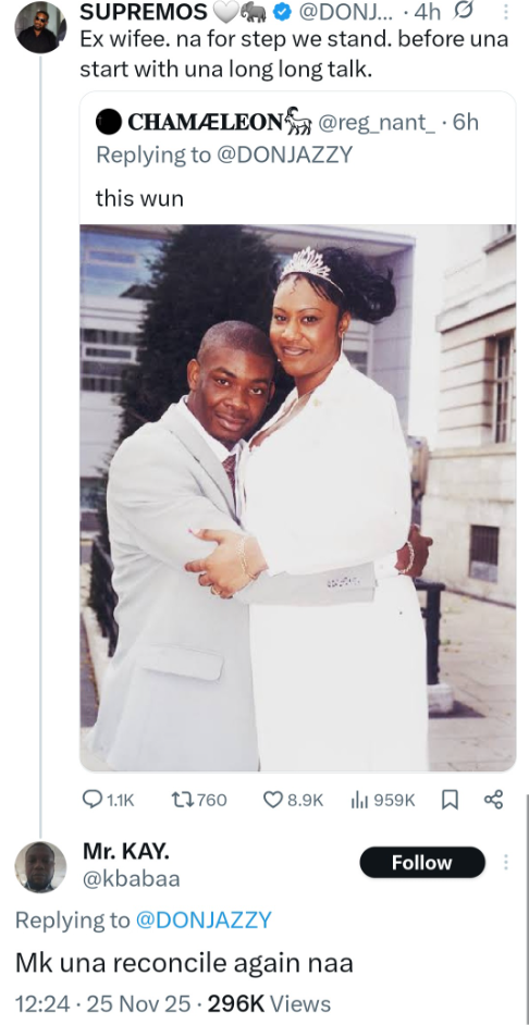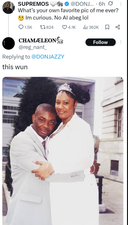 The exchange began when Don Jazzy asked fans on X (formerly Twitter) to share a favorite photo of him and someone. A fan responded by sharing an image of Don Jazzy and his ex-wife, Michelle, on their court wedding day.