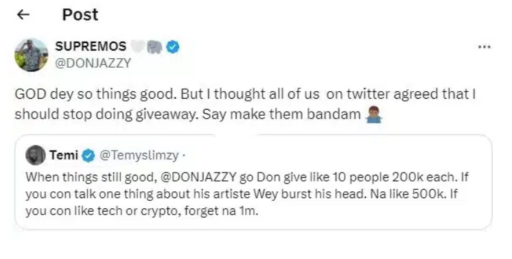“GOD dey so things good. But I thought all of us on twitter agreed that I should stop doing giveaway. Say make them bandam 🤷🏾♂️”