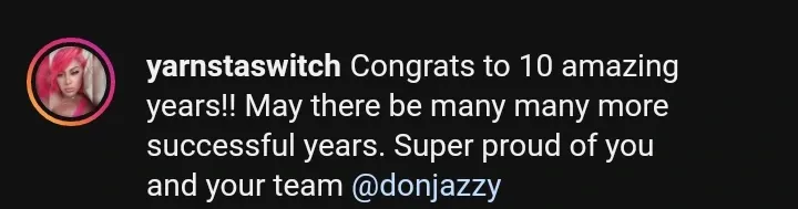 She also took to her social media page react to Don Jazzy’s earlier post. “Congrats to 10 amazing years!! May there be many many more successful years. Super proud of you and the team @donjazzy”, she reacted.