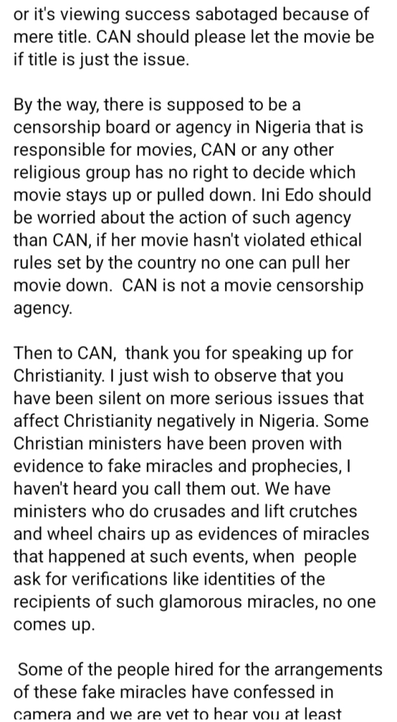 The issue surfaced after Ini Edo publicly expressed concern over CAN’s threat to withdraw the film, with the association arguing that the title undermines the Christian faith.