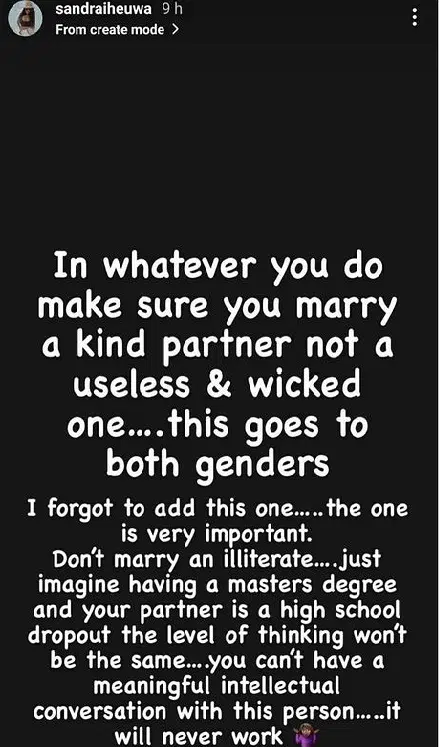 She revealed this an Instagram post, Sandra Iheuwa noted that such relationships would never work due to a conflict of ideas.
