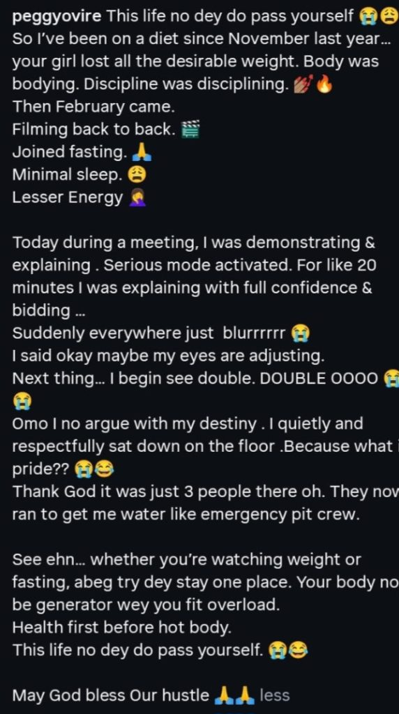 The actress, known for her light complexion, shared a personal experience on Instagram that served as a cautionary tale. She revealed that months of strict dieting nearly caused her to faint during a meeting because her body was completely exhausted.