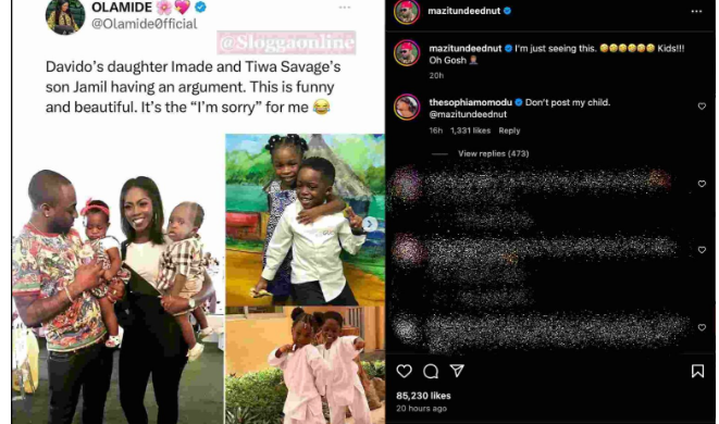 The former singer-turned-blogger shared a video of Davido and Sophia Momodu’s daughter, Imade, arguing with Tiwa Savage’s son, Jamil Balogun.