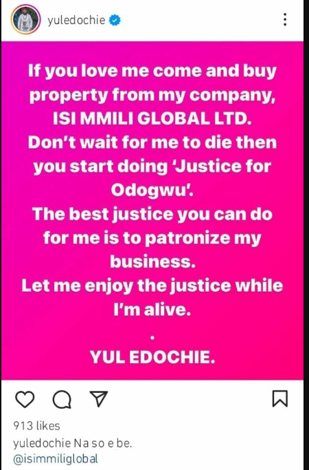 “If you love me come and buy property from my company. Isi Mmili Global LTD. Don’t wait for me to die then you start doing’ Justice for Odogwu’. The best justice you can do for me is to patronize my business.