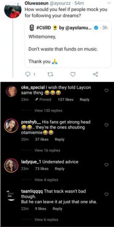 The fan, identified with the Twitter handle @taiwoalabiho2, while making this appeal to Whitemoney wrote, “Whitemoney don’t waste that funds on music. Thank you.”