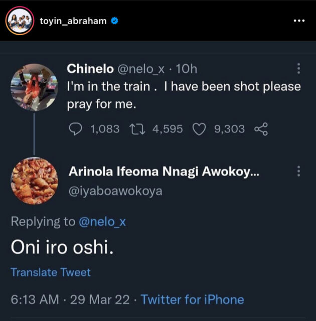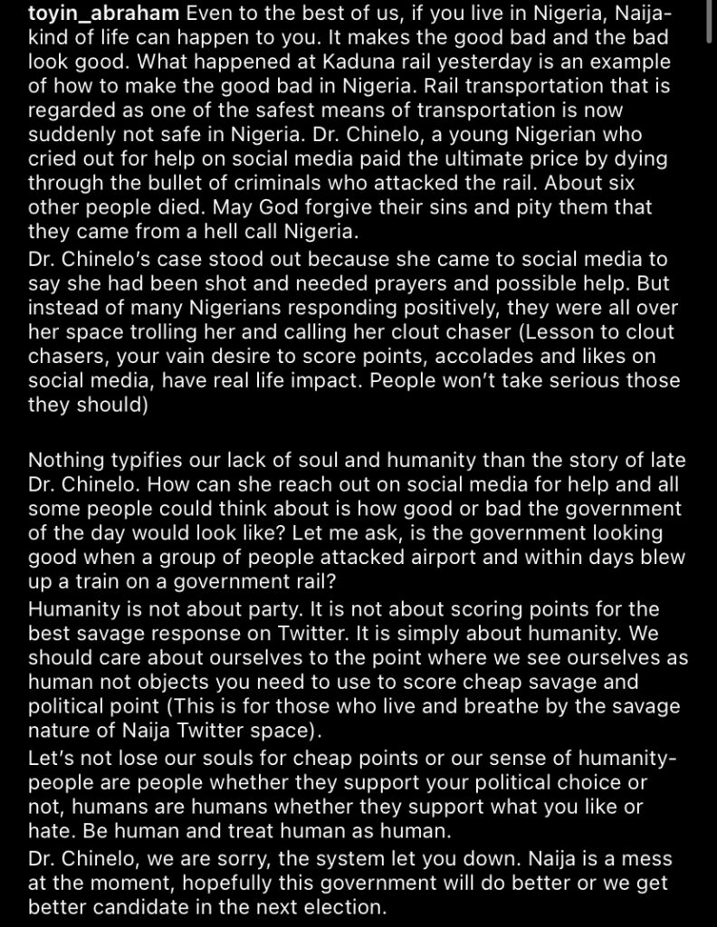 Popular actress, Toyin Abraham has reacted to the death of Dr Chinelo, a victim of the railway attack on Monday 28th March 2022.