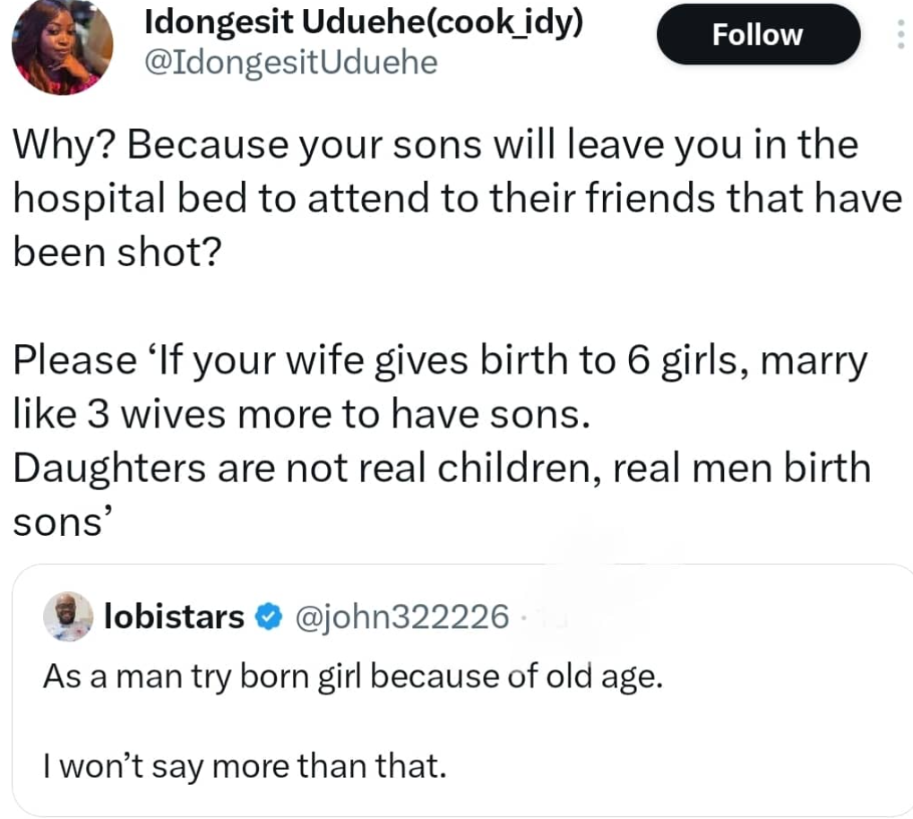 A comment suggesting that “daughters are not real children” and advising men to marry multiple wives if their first wife gives birth to six girls has ignited a furious debate across Nigerian social media.