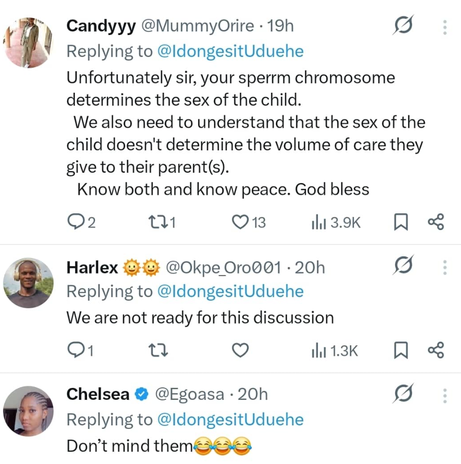 - The controversial statement drew instant backlash, with users emphasizing that the man’s chromosome determines a baby’s sex,