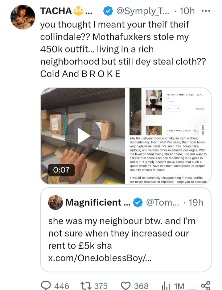 BBNaija star Tacha Akide has accused her UK neighbor of stealing her clothes after he disputed her statement about their rent being £5,000 (N10.3 million) per month.