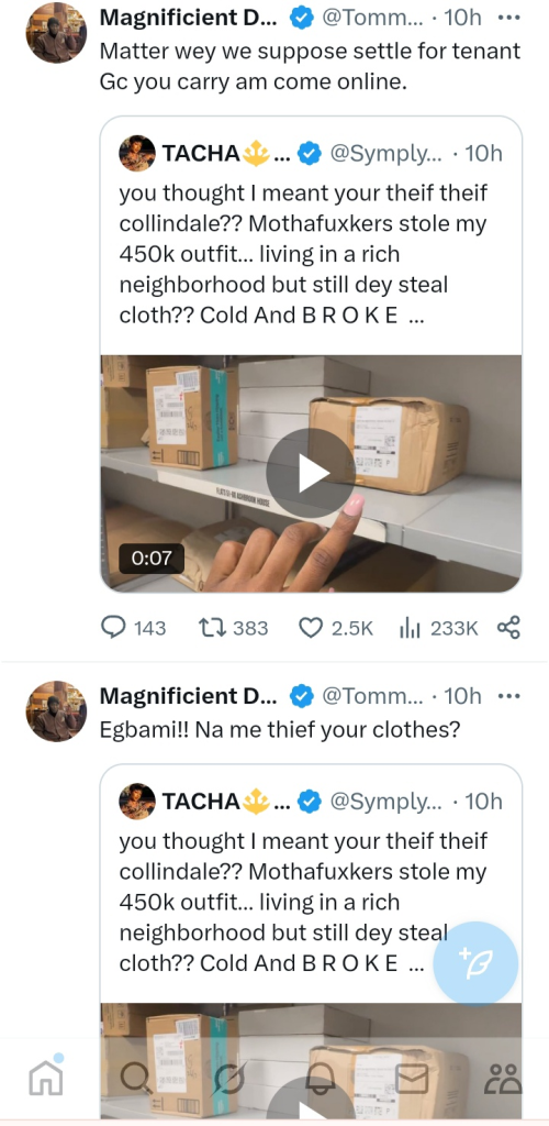 Tacha responded by revealing that they stole her clothes during her time there, saying, “you thought I meant your theif theif collindale?? Mothafuxkers stole my 450k outfit… living in a rich neighborhood but still dey steal cloth?? Cold And B R O K E,” she reacted.