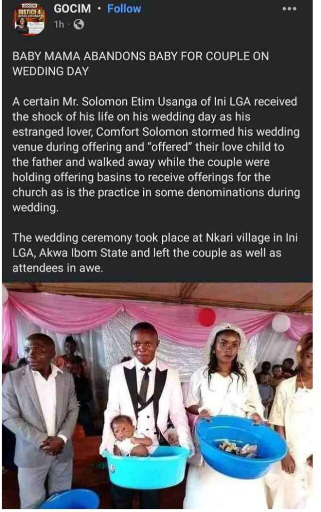 A certain Mr. Solomon Etim Usanga of Ini LGA received the shock of his life on his wedding day as his estranged lover, Comfort Solomon stormed his wedding venue during offering and “offered” their love child to the father and walked away while the couple were holding offering basins to receive offerings for the church as is the practice in some denominations during wedding.