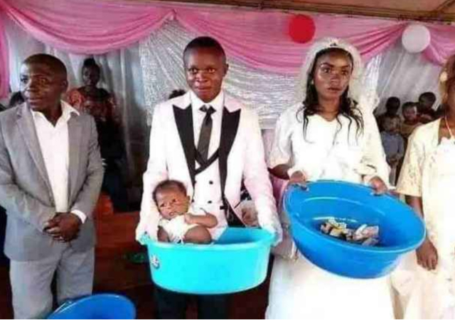 Reports have it that a bizarre stunt occurred during wedding proceedings as a lady abandoned her baby for the groom and his newlywed wife in front of the congregation.