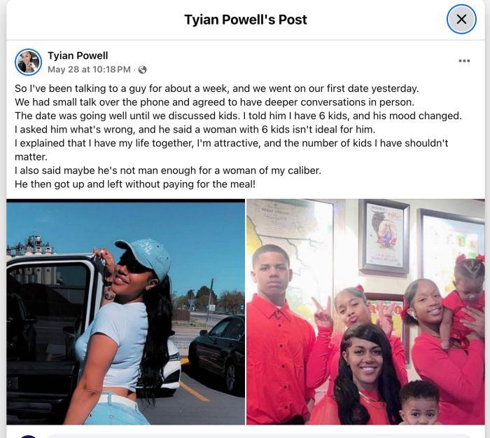Tyian Powell, a single mother from the U.S., recently shared a story that quickly gained attention online after a date ended suddenly when her companion discovered she had six kids.