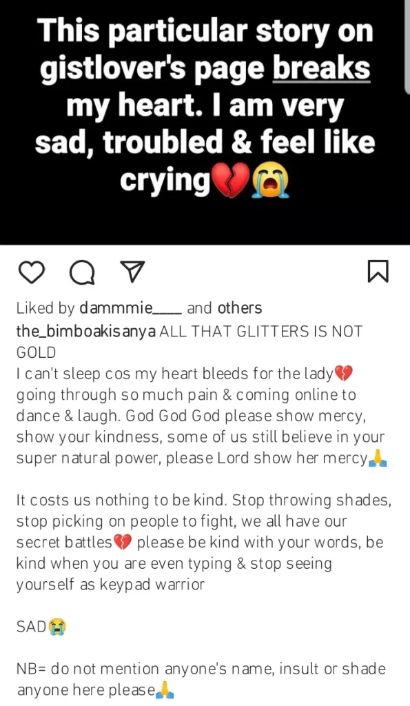 I can’t sleep cos my heart bleeds for the lady going through so much pain & coming online to dance & laugh. God God God please who mercy, show your kindness, some of us still believe in your super natural power, please Lord show her mercy. It costs nothing to be kind. Still throwing shades, stop picking on people to fight, we all have out secret battles please be kind with your words, be kind when you are even typing & stop seeing yourself as keypad warrior. Sad”.