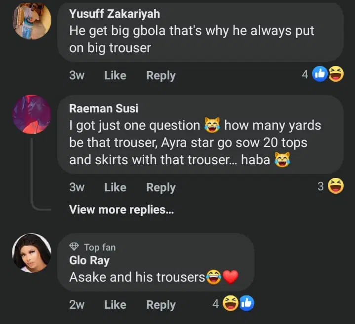 - Asake apparently is a lover of big trousers as he has been seen several times rocking such pants.
