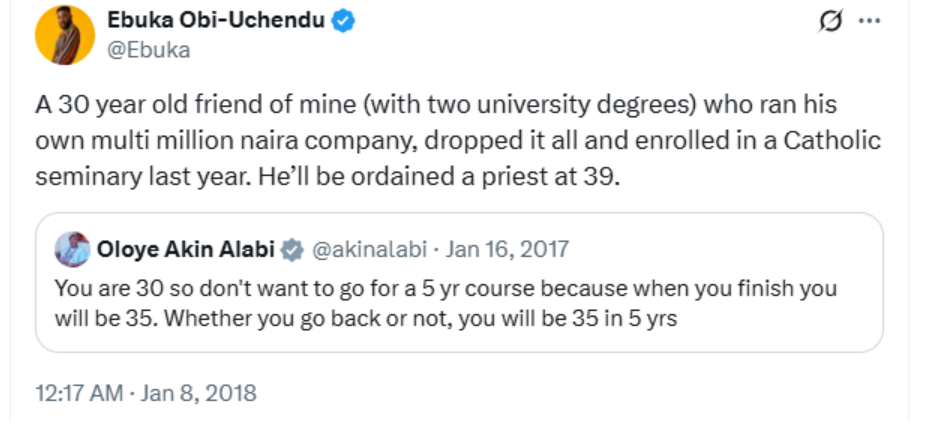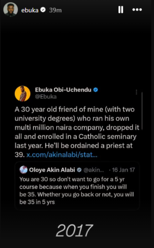 Back in 2018, Ebuka revealed that Chris had dropped two university degrees and walked away from his multi-million naira company to pursue priesthood. At the time, Chris was just 30 years old and had joined the seminary in 2017.