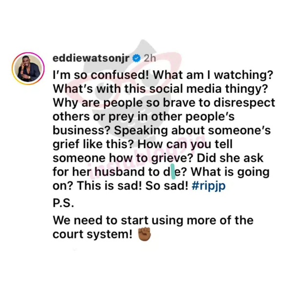 Actor Eddie Watson has criticized Esther for her comments. He characterized her actions as insulting. He questioned why the actress sought to educate Junior Pope’s wife how to grieve her husband.