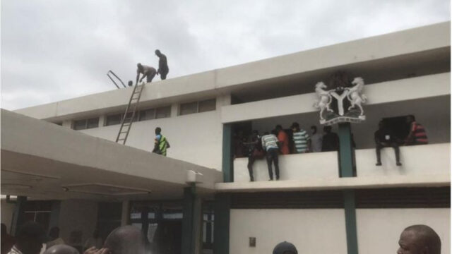 A dramatic scene was recorded in the Edo state House of Assembly today August 6, as some men were seen removing the iconic legislative mace on top of the building and also dismantling the roof.