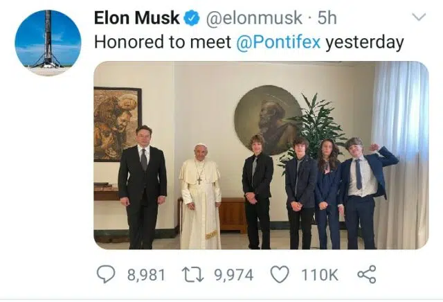 “Honored to meet @Pontifex yesterday,” the billionaire tweeted,