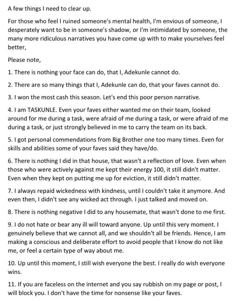 “A few things I need to clear up. For those who feel I ruined someone’s mental health, I’m envious of someone, I desperately want to be in someone’s shadow, or I’m intimidated by someone, the many more ridiculous narratives you have come up with to make yourselves feel better, Please note,