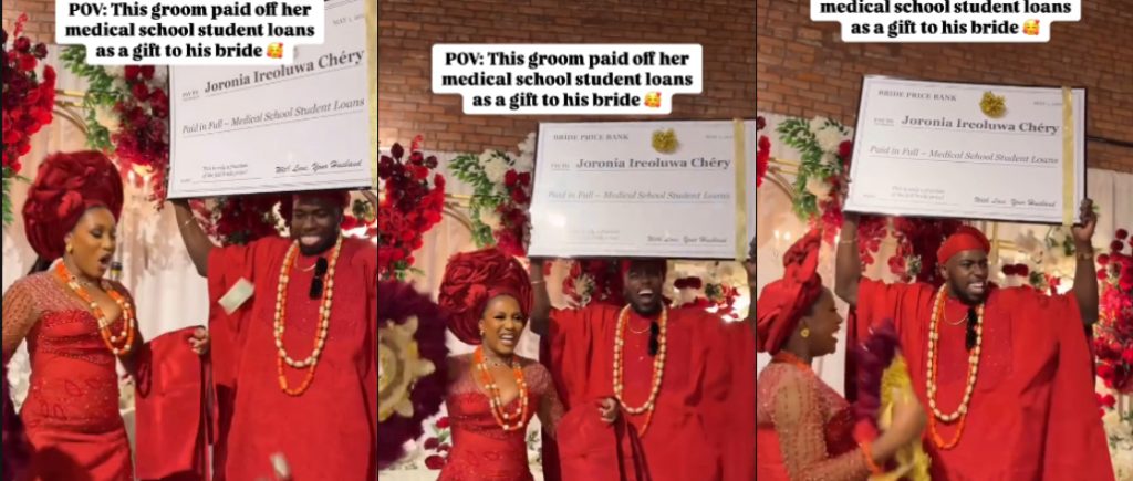 - A groom left his bride in awe after gifting her a debt-free start to their marriage by paying off her entire medical school loan.