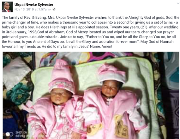 “The family of Rev. & Evang. Mrs. Ukpai Nweke Sylvester wishes to thank the Almighty God of gods, God, the prime changer of time, who makes a thousand year to collapse into a second for giving us a set of twins – a baby girl and a boy. He does His things at His appointed season. Twenty one years, (21) after our wedding in 3rd January, 1998,God of Abraham, God of Mercy located us and wiped our tears, changed our prayer point and gave us double miracle . Join us to say, “Father to You oo, and be all the Glory, to You oo, be all the Honour, to you Ancient of Days oo, be all the Glory and adoration forever more”. May God of Hannah fovour all my friends as He did to my family in Jesus’ Name, Amen!”