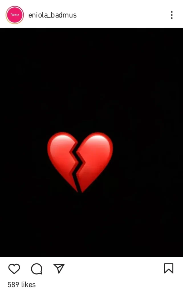 Taking to Instagram, Eniola who isn’t in the country put up a heartbroken heart emoji.