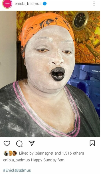 Eniola Badmus is seen in the picture with her face plastered in white powder, which stands out against her dramatic black lipstick.
