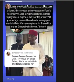 Responding to the circulating video, Etinosa condemned Nwoko’s remarks. In a post shared on her Instagram Stories, she questioned why the senator continually brings Regina into public discussions, especially at a time when the country is facing significant security challenges.