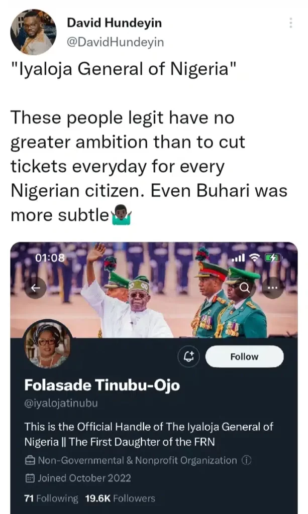 “Iyaloja General of Nigeria. These people legit have no greater ambition than to cut tickets every day for every Nigerian citizen. Even Buhari was more subtle.”