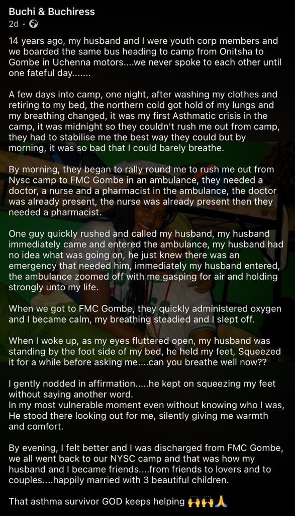 The couple returned to their NYSC camp, where their friendship gradually blossomed into love, eventually leading to marriage and three children.