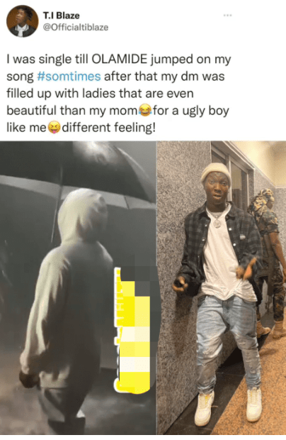 According to him, the ladies who have hit his DM are finer and beautiful than his mother and he was single till Olamide jumped on his song. T.I Blazed remarked that he an ugly boy but with all